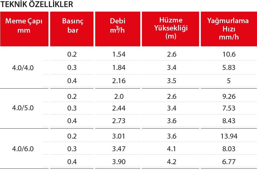 ✅ Gri sprinkTam daire sulama yaparak yarıçap 12 m. İle 18 m. mesafe arası basınç hızına göre homojen su dağılımı yapar.